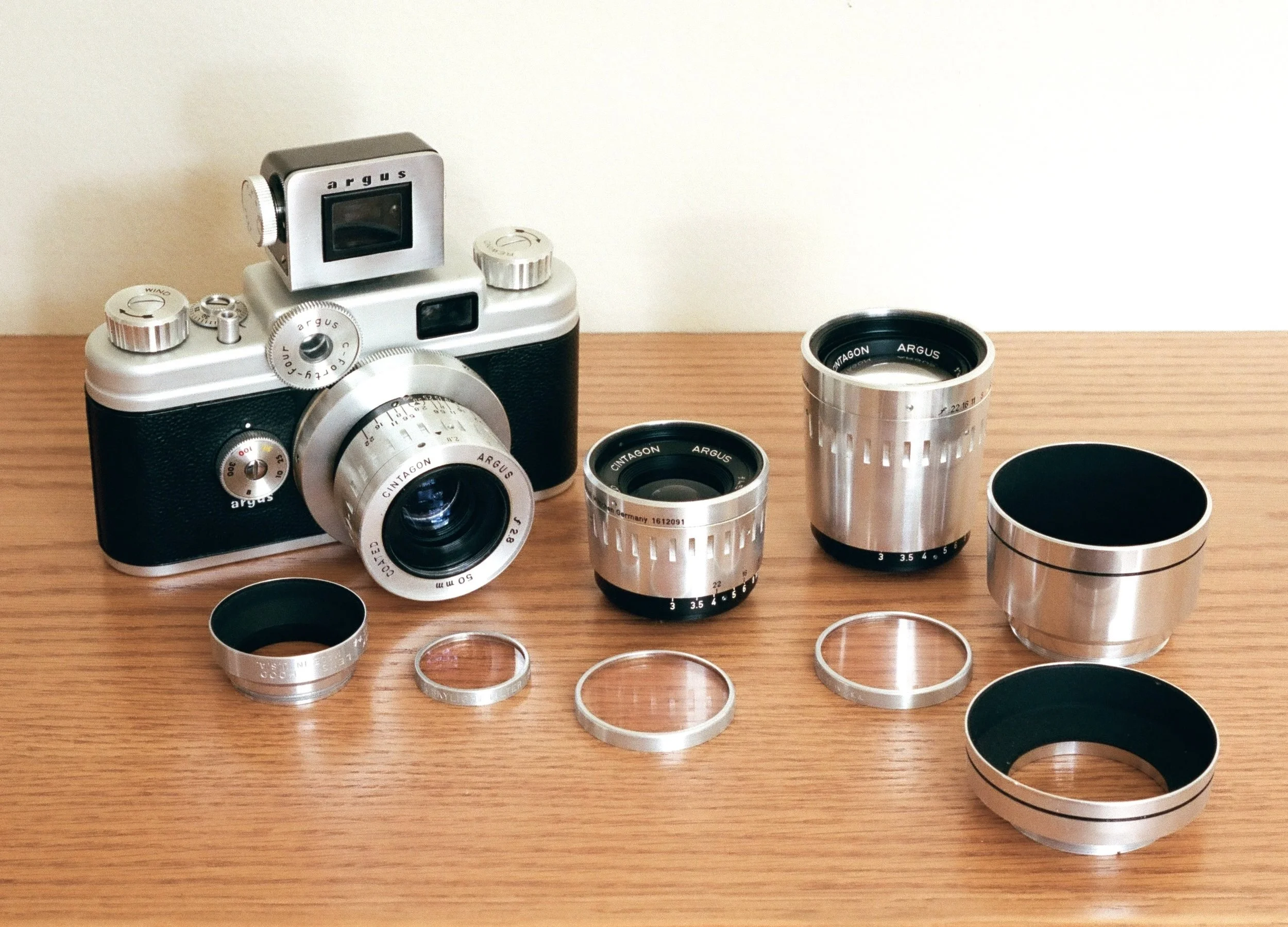 The C44 came with three lenses and other accessories as shown above. The lenses are branded as Argus Coated Cintagon. The 50mm lens is U.S-made and the others are marked ‘Steinheil München Germany’.