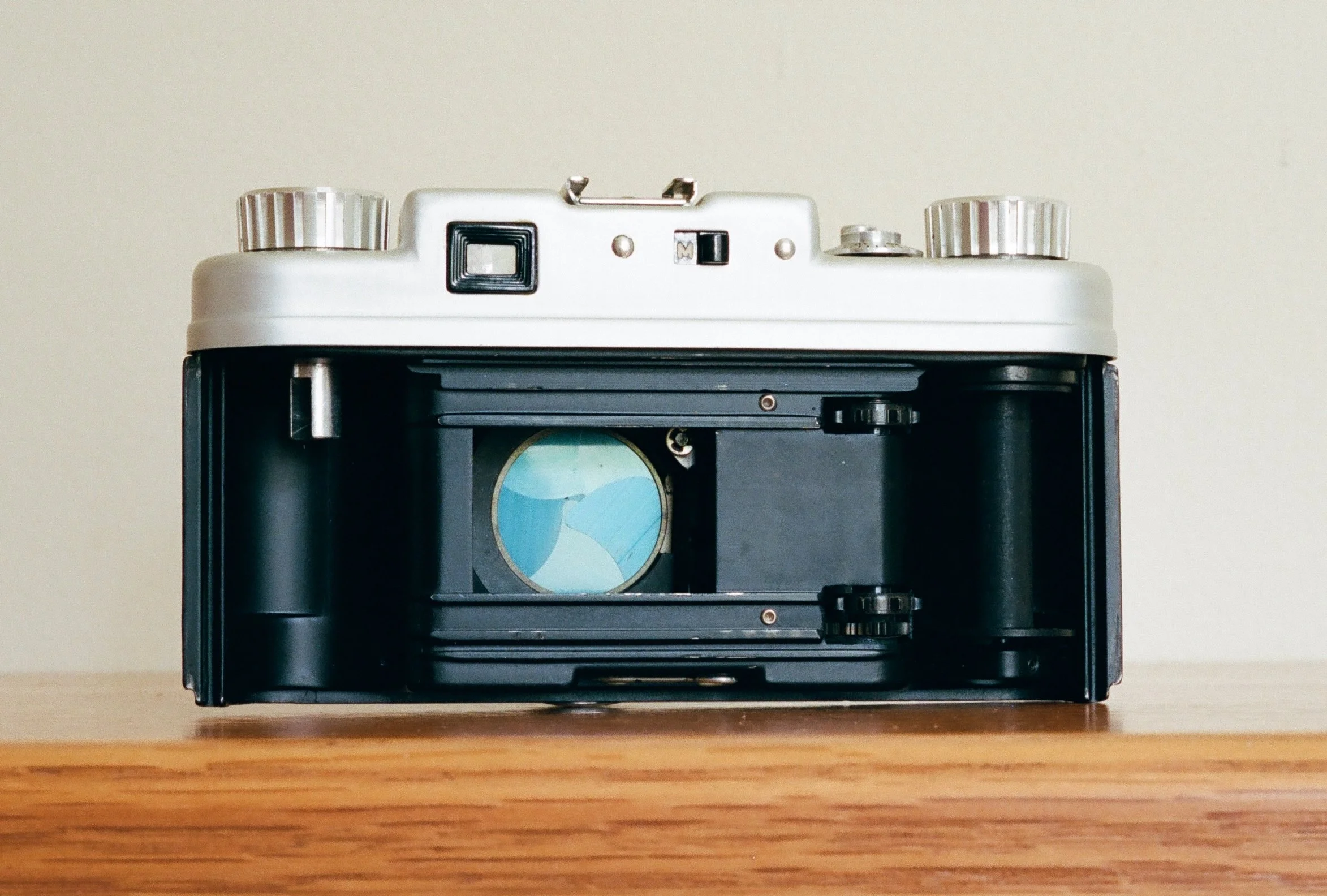 Argus C44 with the back removed for film loading, showing the blue-colored shutter.