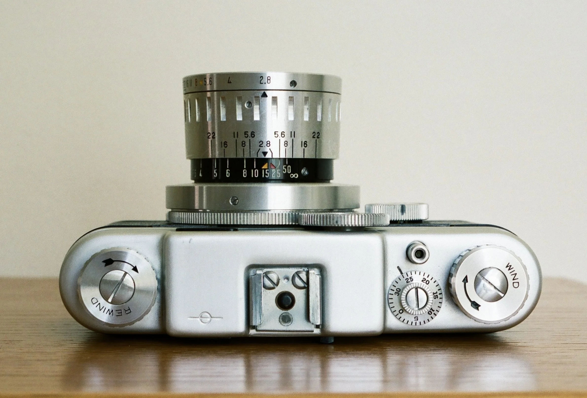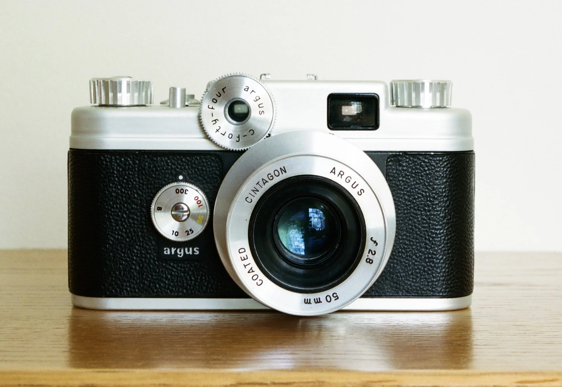 Argus C44 with 50mm f/2.8 Cintagon lens. (Color photos of the camera were made with a Nikon F, 55mm f/3.5 Micro-Nikkor-P.C, and Portra 400.)