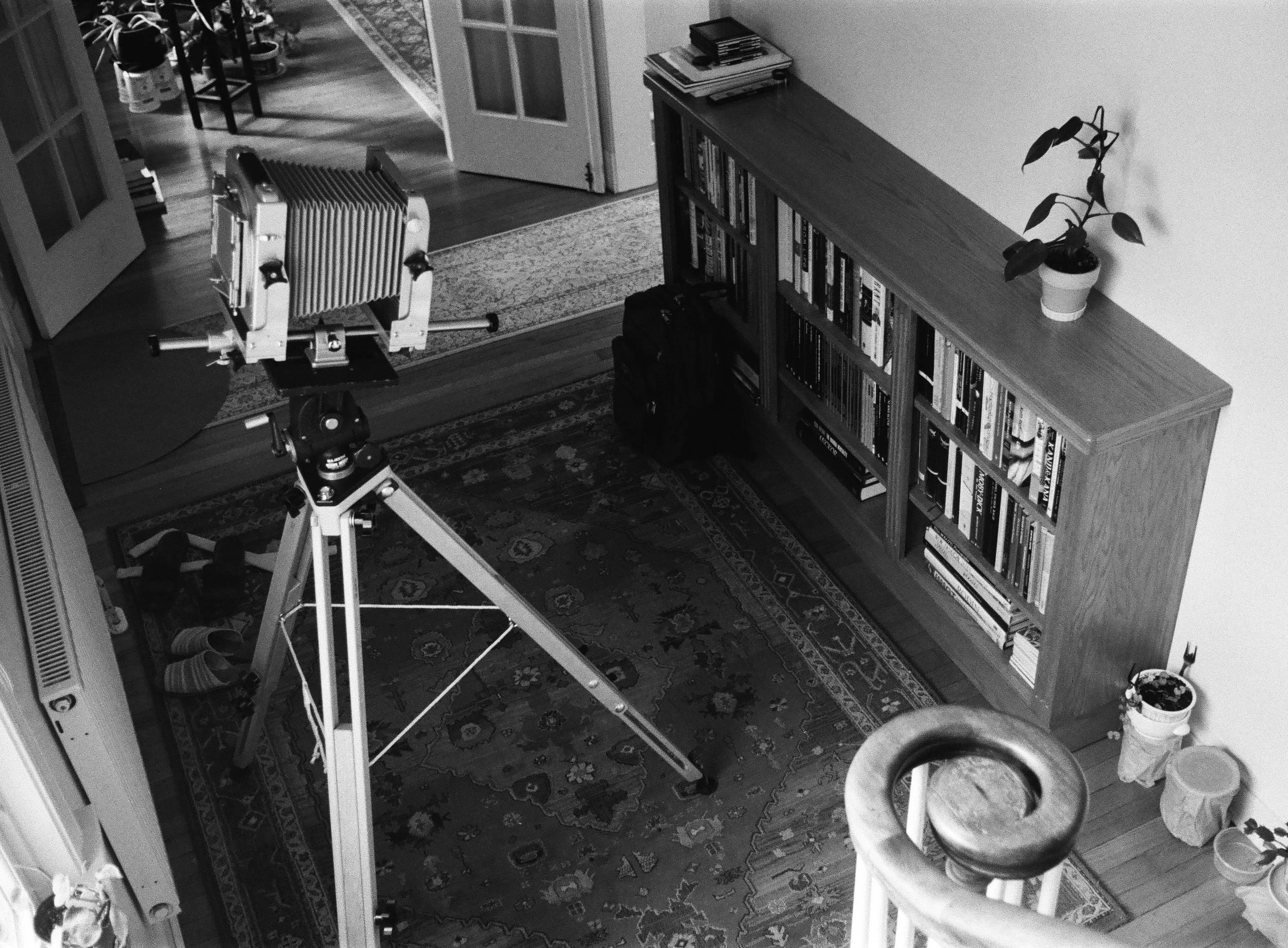 4x5 Calumet setup for the plant photo below. The camera is on a Zone VI tripod with a Majestic head. (Photo taken with a Nikon F, 35mm f/2.8 Nikkor-S, Tri-X, 2024.)