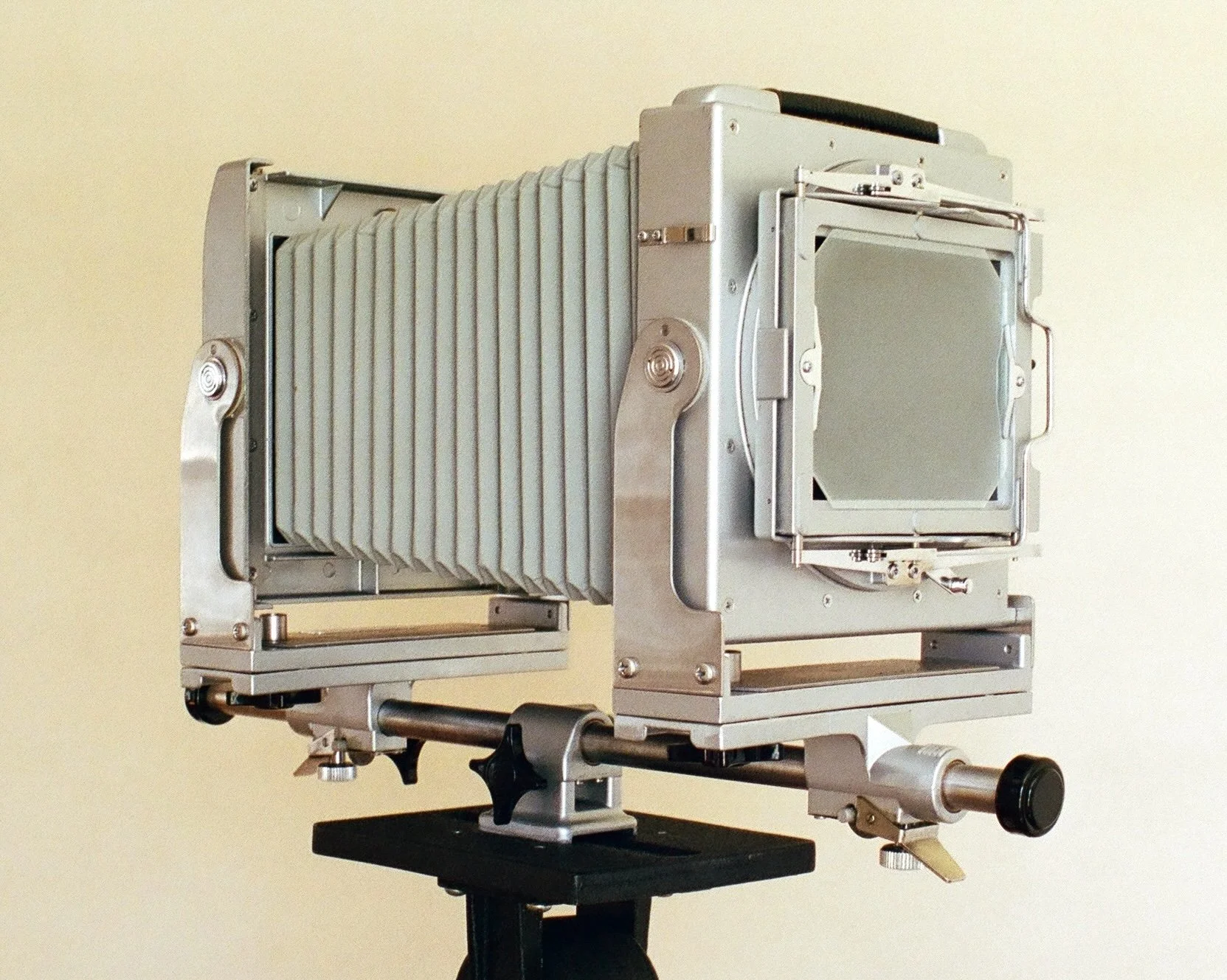 4x5 Calumet CC-400 on a Gitzo R. No. 4 tripod head. (Color photos of the camera were made with a Nikon F, 55mm f/3.5 Micro-Nikkor-P.C, and Portra 400.)