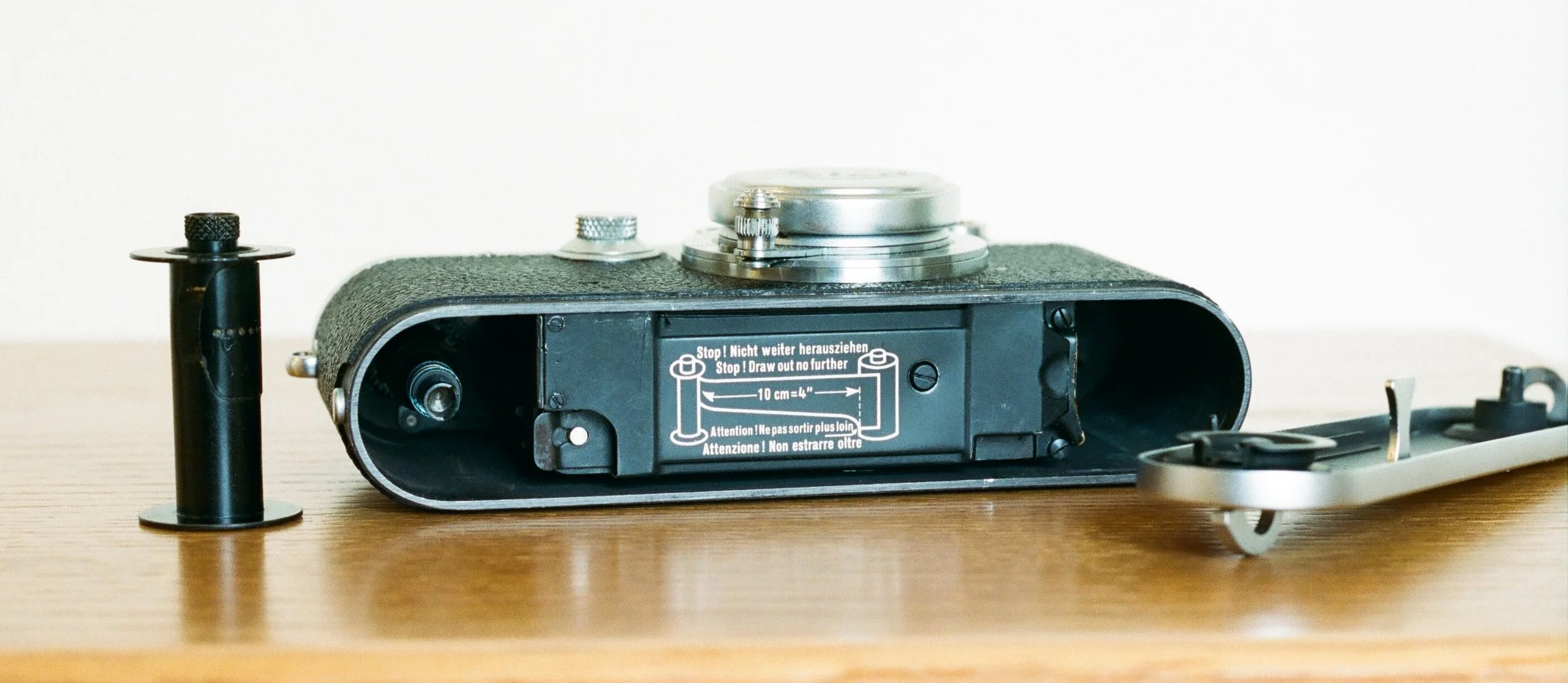 Remove the bottom of the camera. There’s a drawing inside, showing how the film leader is to be trimmed. Leica made a template, but it’s not necessary and I don’t have one. I use a pair of scissors and follow the drawing.