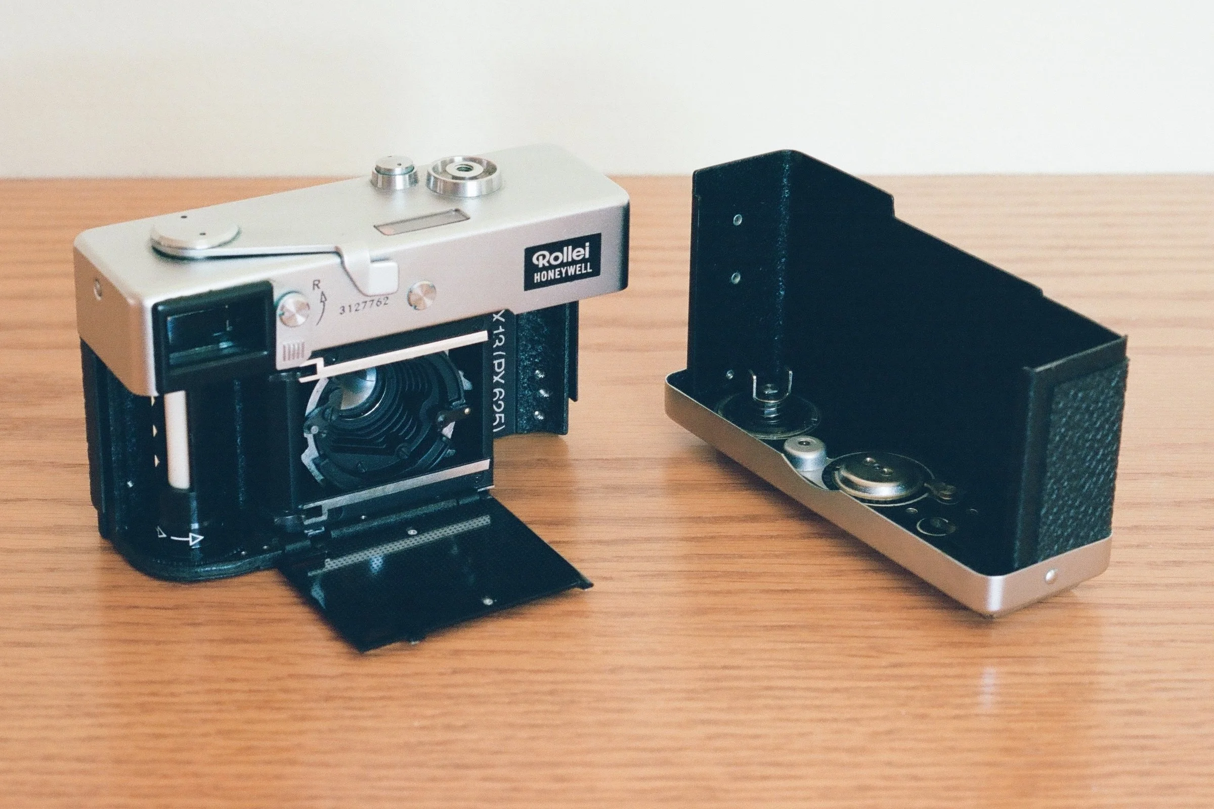Rollei 35 ready to load film. As with the Nikon F, the back removes and it’s a metal-to-metal fit with no foam light seal material — an excellent design feature.