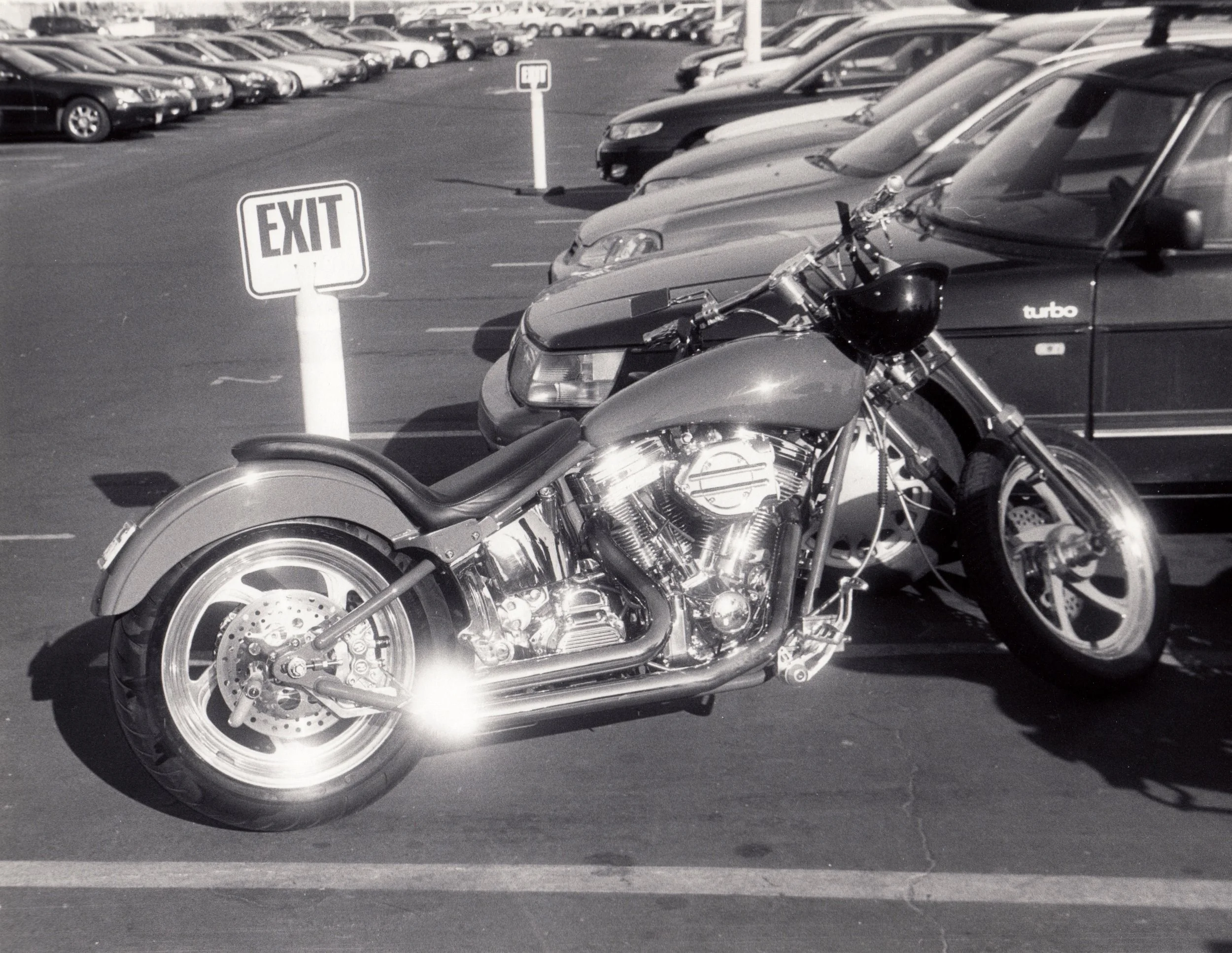 Custom chopper motorcycle, low handlebars Pacific Palisades, Calif.: Coast Highway at Sunset Blvd. Zeiss Ikon Contina IIa, 45mm f/2.8 Novicar-Anastigmat, Tri-X, early 2000s.