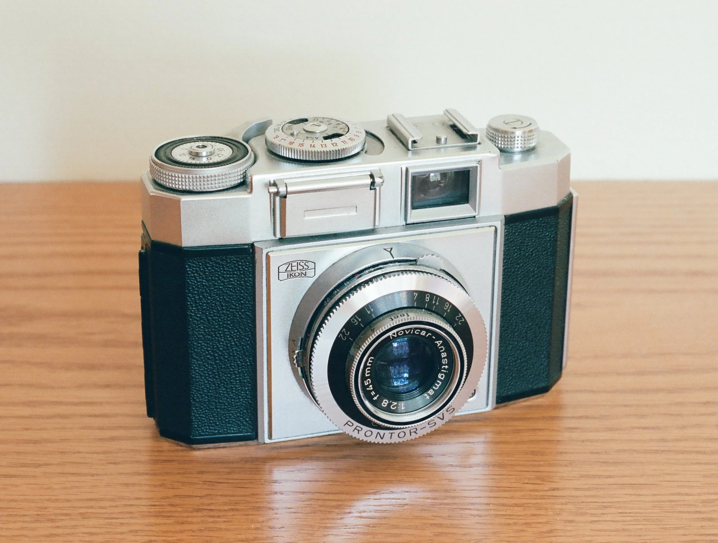 Zeiss Ikon Contina IIa with 45mm f/2.8 Novicar-Anastigmat lens. (This photo was made with a Nikon F, 55mm f/3.5 Micro-Nikkor-P.C, and Portra 400.)